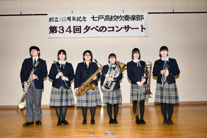 12月14日(日)七戸高校第一体育館にて、「創立100周年記念 第34回夕べのコンサート」を開催しました。直前に感染症による学年閉鎖がありましたが、部員全員が出演することができました。また、八甲田吹奏楽団様には賛助出演していただき、普段は演奏できないような大編成の楽曲にもチャレンジすることができました。この舞台で引退となる3年生は、演奏と2部の曲紹介も無事に務めました。多くのお客様にご来場いただき、誠にありがとうございました。